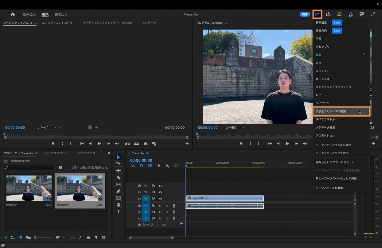 今回は文字起こしに関する編集なので、画面右上にある「ワークスペース」を選択してワークスペースの表示を「文字起こしベースの編集」に切り替えます。