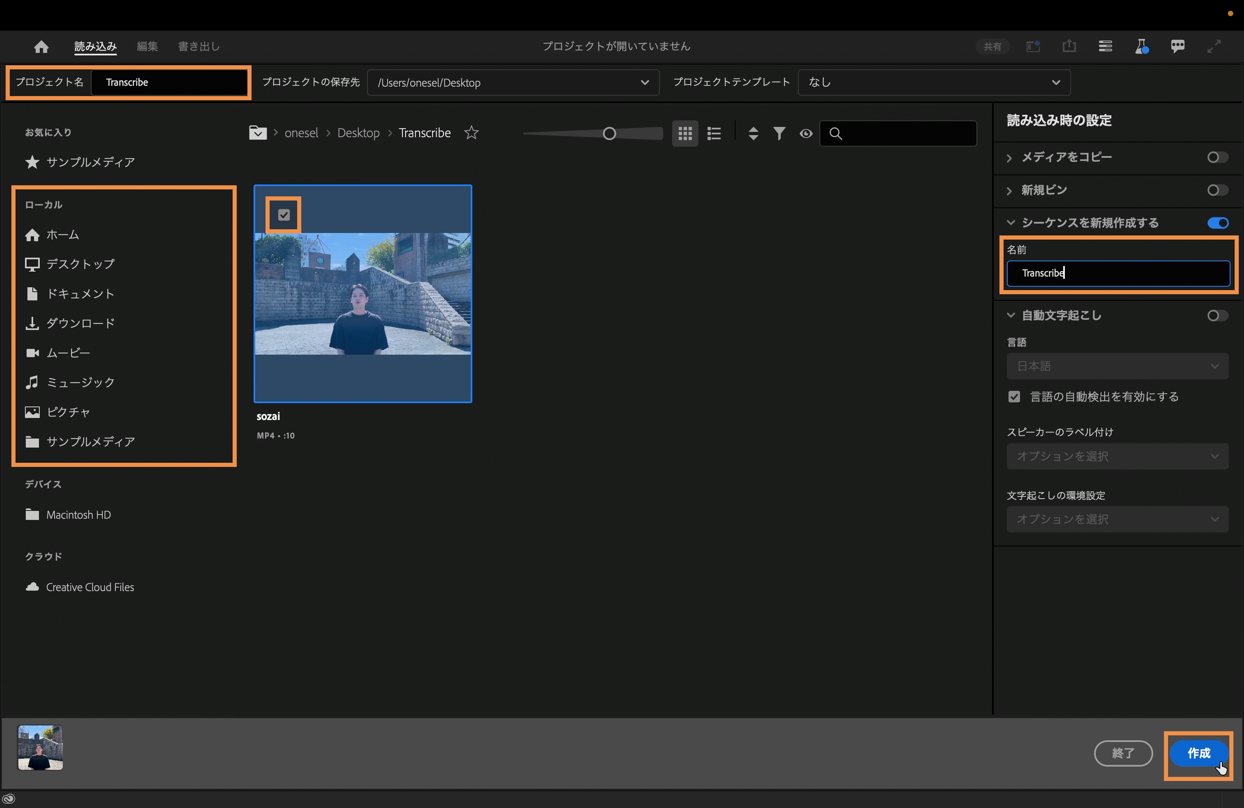 プロジェクトの新規作成画面が表示されたら、プロジェクト名とシーケンス名を「Transcribe」に変更し、「ローカル」の欄から事前にダウンロードした素材を選んでチェックボックスにチェックを入れて右下の「作成」を選択します。