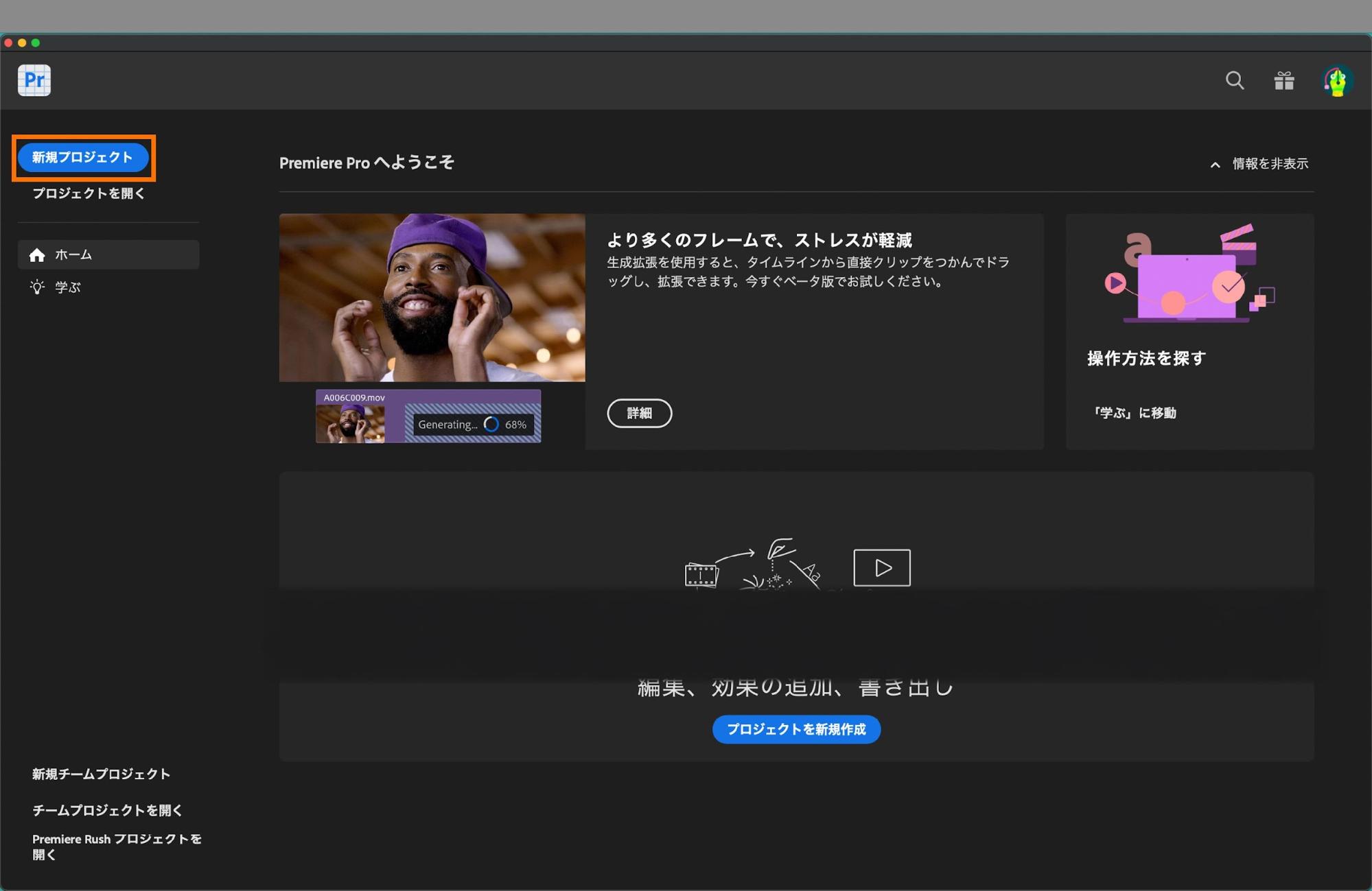 Premiere Proを起動してプロジェクトの新規作成画面を表示して、「新規プロジェクト」を選択します。