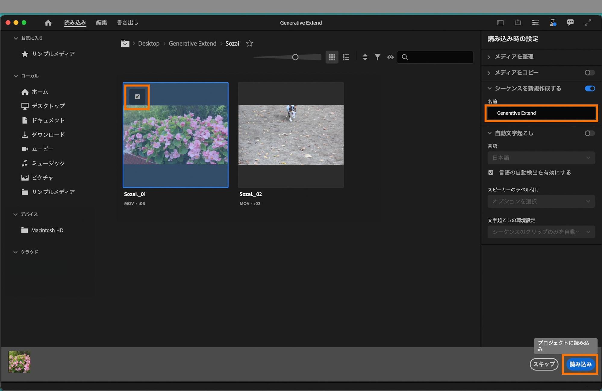 プロジェクトの新規作成画面が表示されたら、シーケンス名を「Generative Extend」に変更し、「ローカル」の欄から事前にダウンロードした素材を選んでチェックボックスにチェックを入れて右下の「読み込み」を選択します。