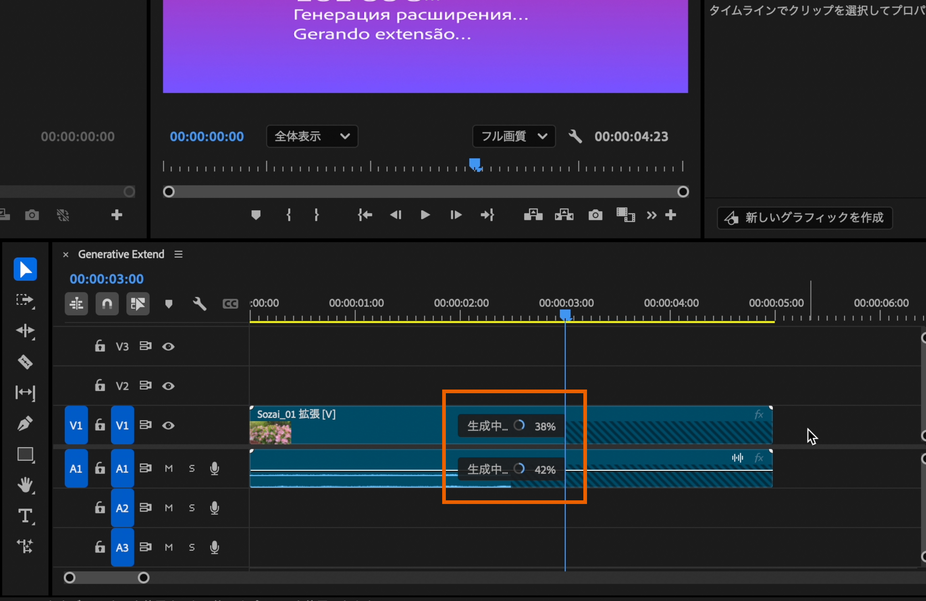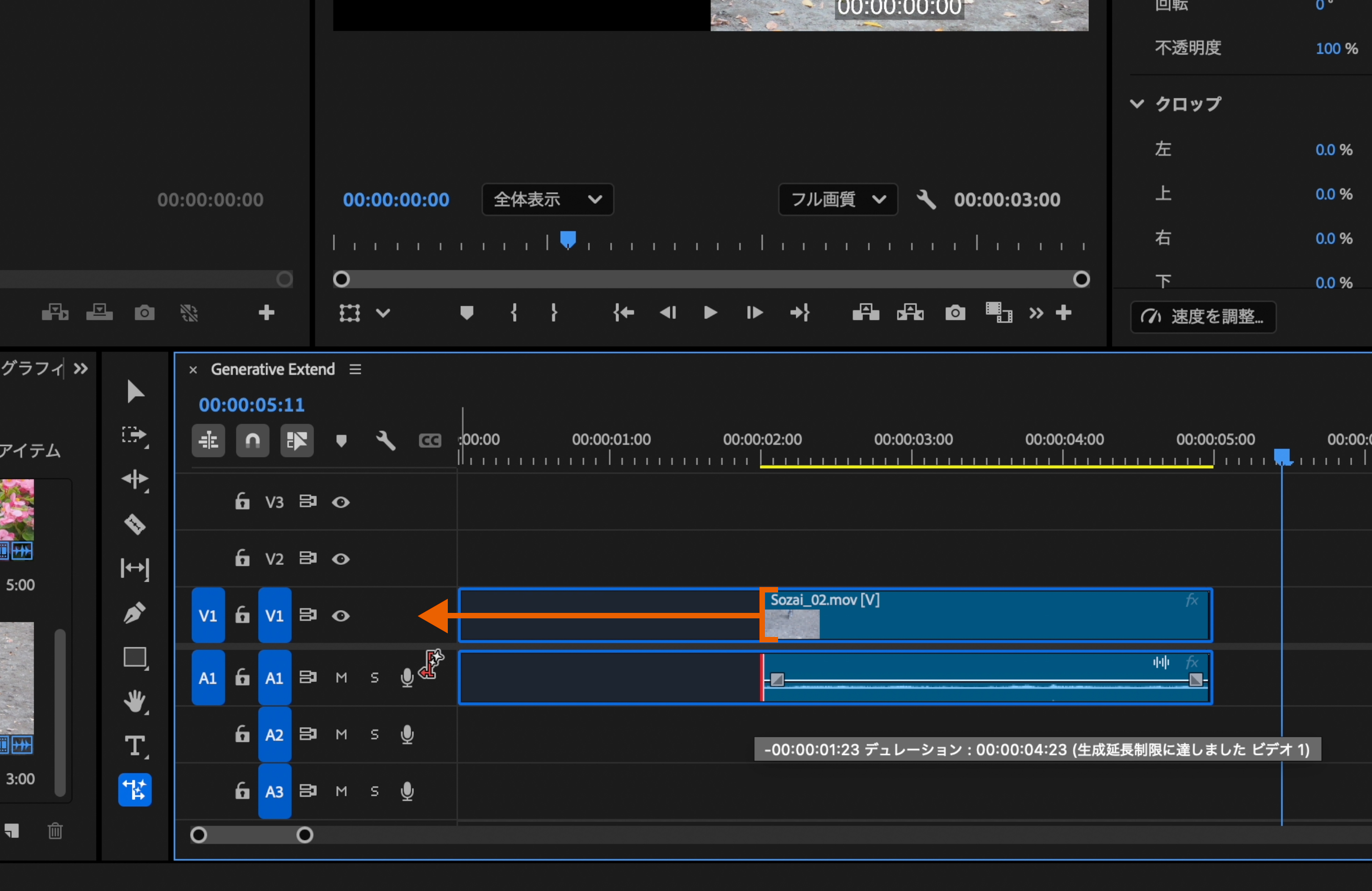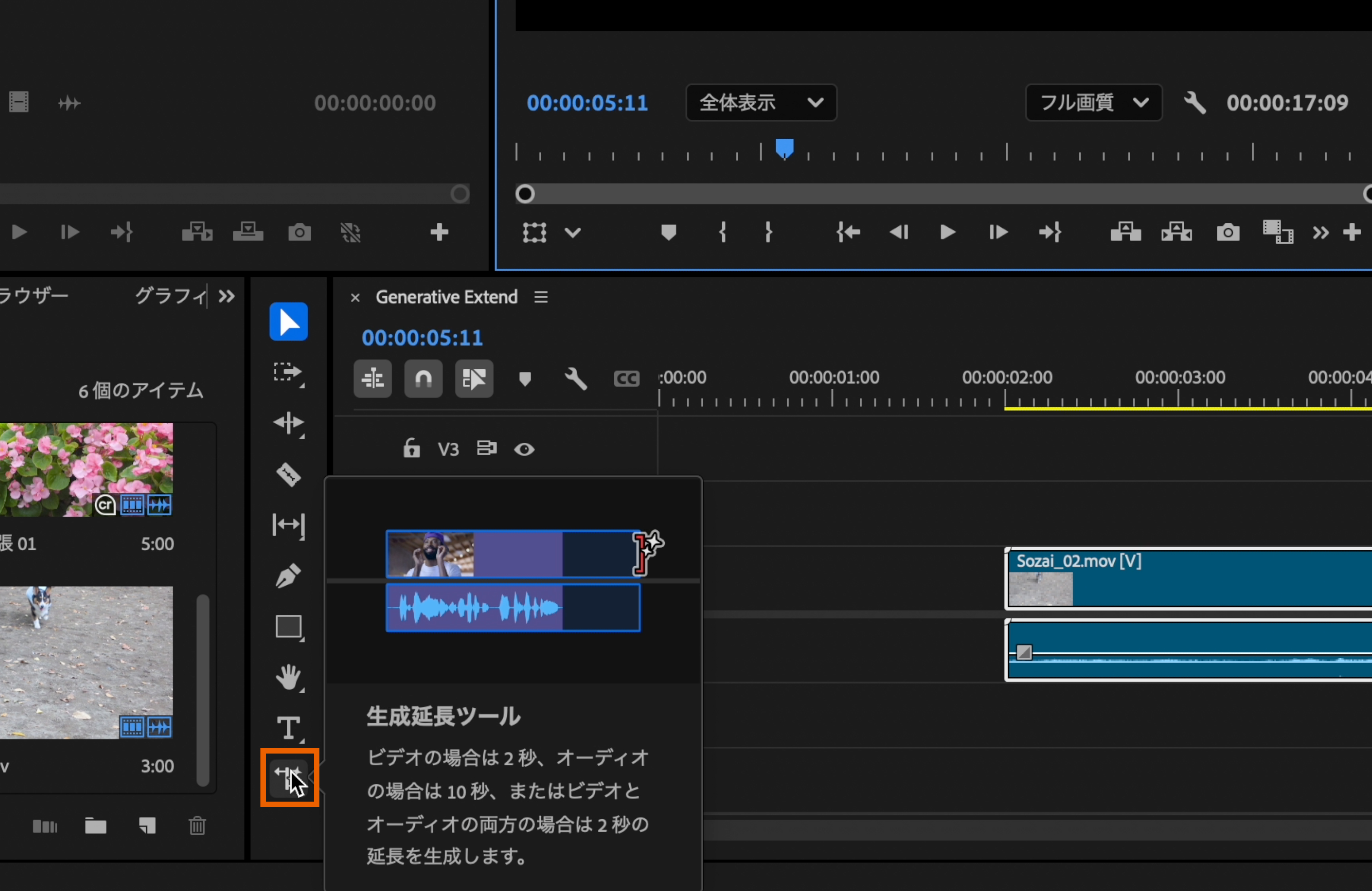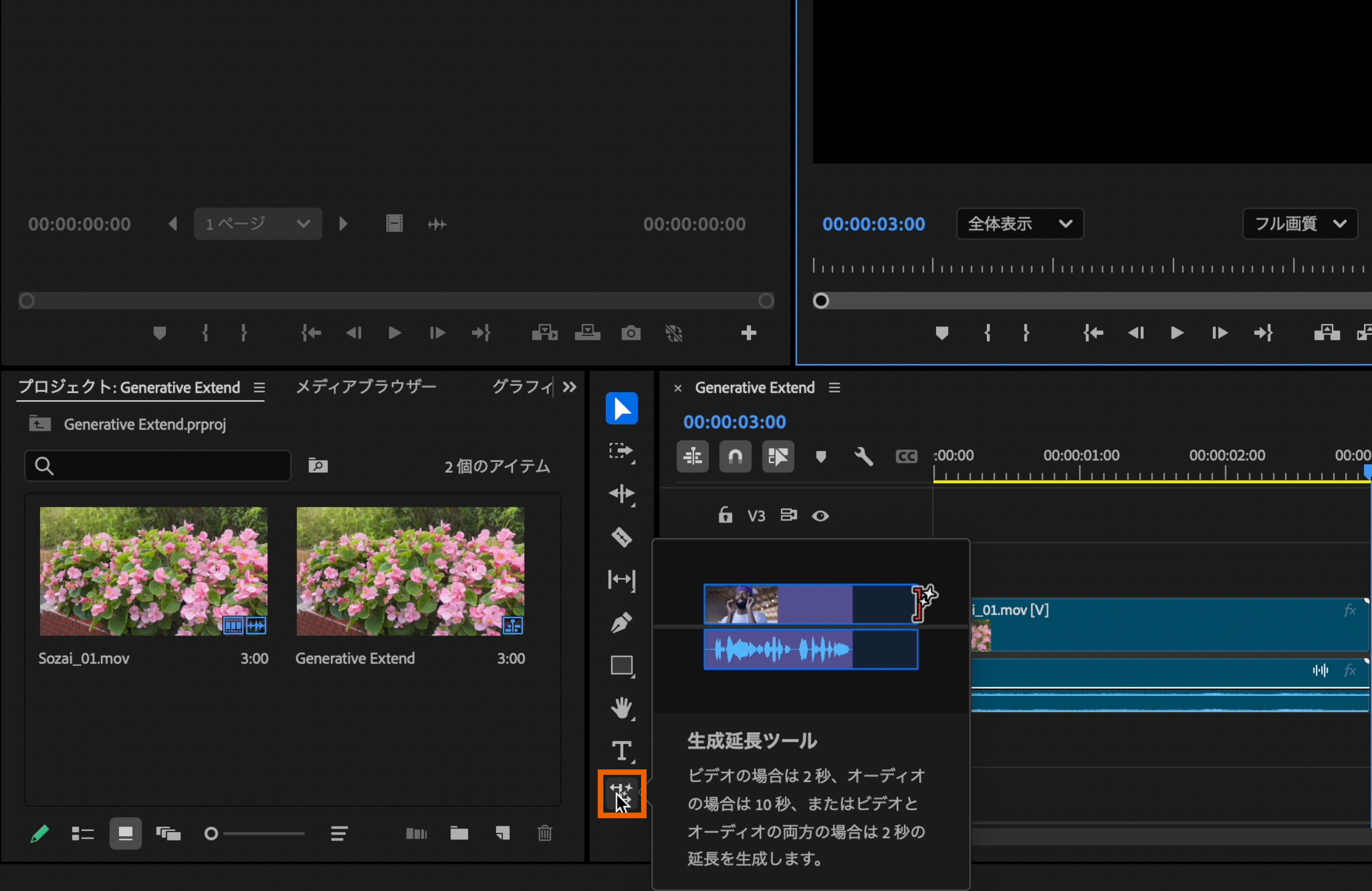 生成延長(ビデオクリップまたはオーディオクリップの追加)