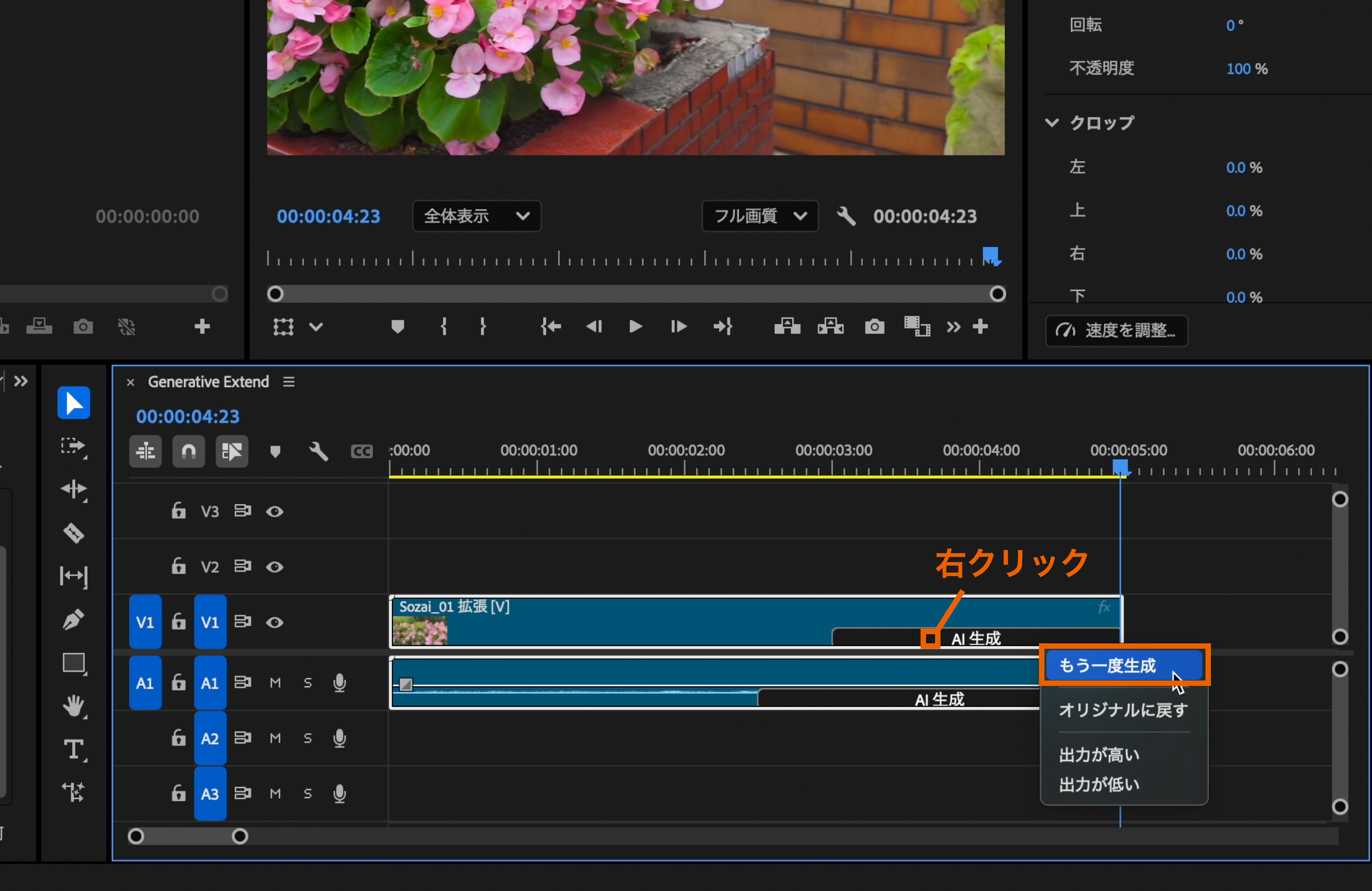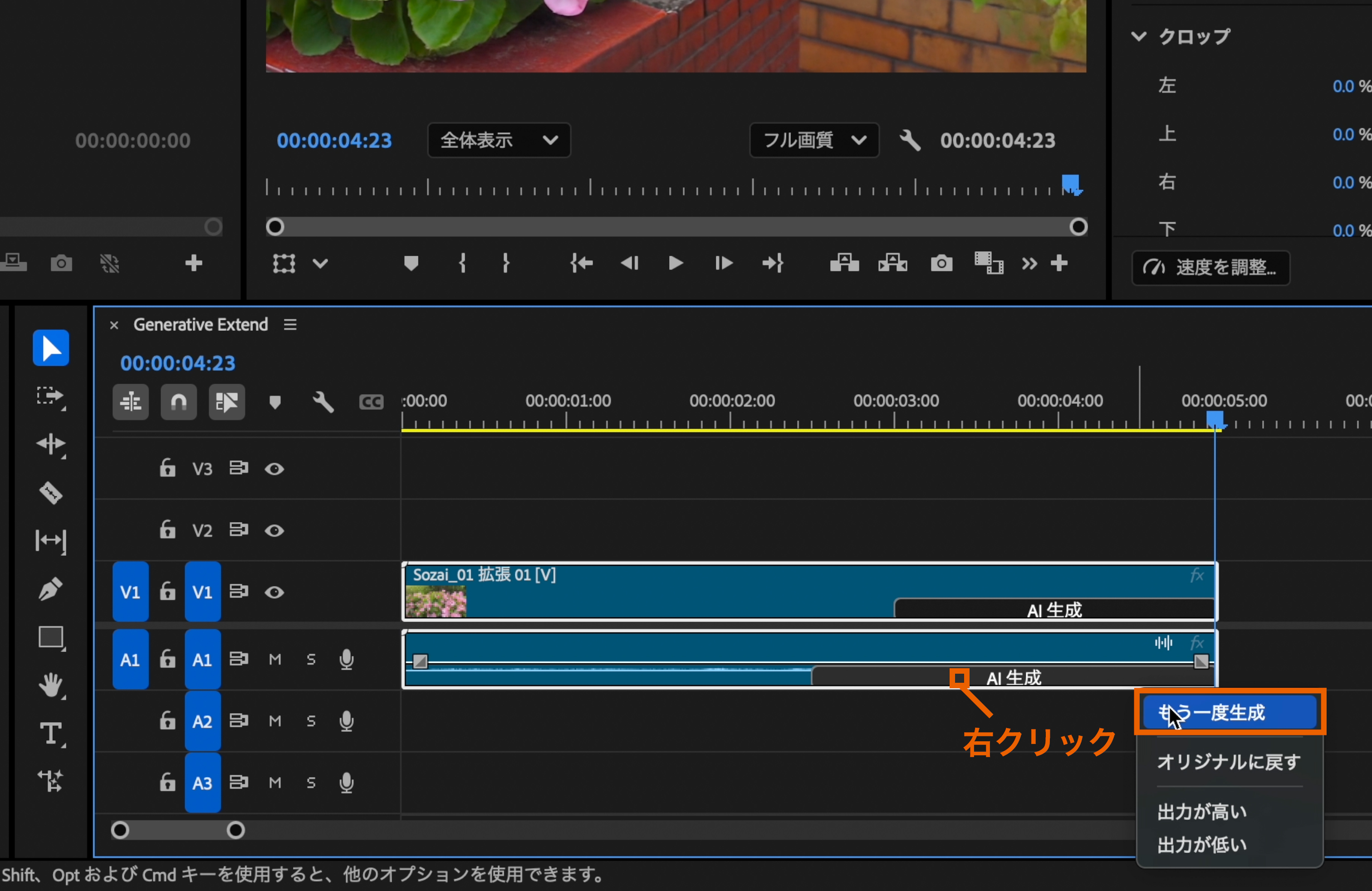 タイムラインパネル上の該当クリップにある「AI生成」のラベルを右クリック。