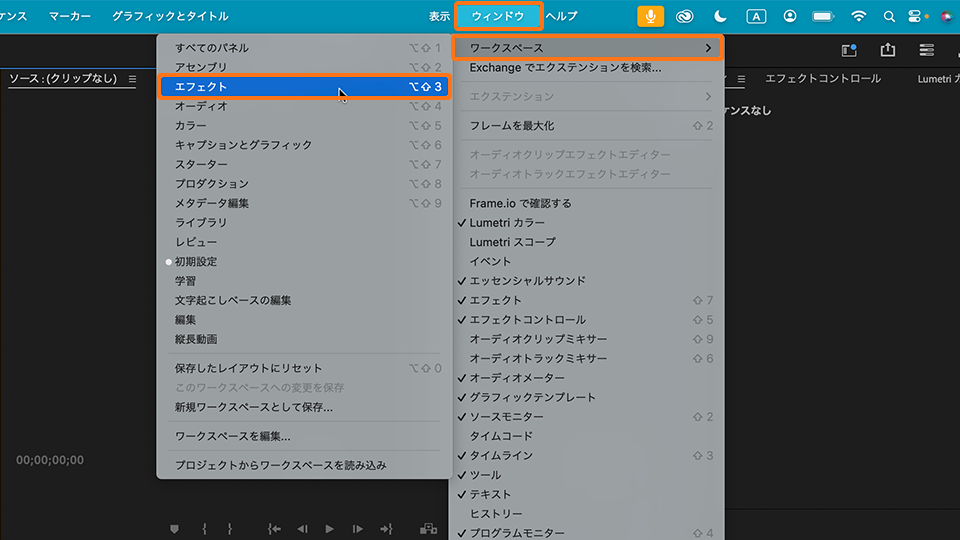 Premiere Proの編集画面が立ち上がったら、ワークスペースを「エフェクト」に変更します。