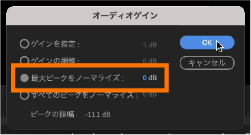 「オーディオゲイン」内の「最大ピークをノーマライズ」を選択し「0 db」であることを確認したら[OK]を押します。