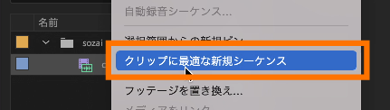 「プロジェクト」パネルで「Clip_01.mp4」を選択し、右クリックから「クリップに最適な新規シーケンス」を選択。シーケンス名を「bgm_ducking」に変更します。