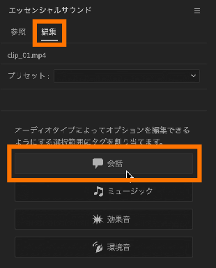 「Clip_01.mp4」選択します。「エッセンシャルサウンド」パネルから「編集」を選択し、「会話」を適用させます。