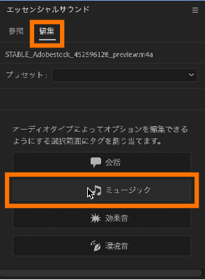 タイムライン上の「STABLE」を選択して、「エッセンシャルサウンド」パネルから「編集」を選択し、「ミュージック」を適用させます。