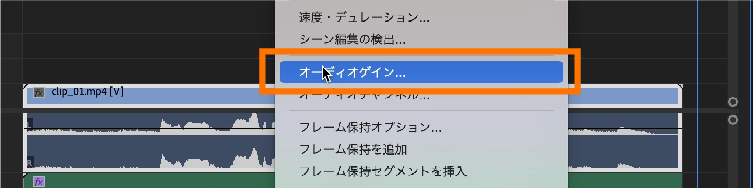 タイムライン[A1]の「Clip_01.mp4」を右クリック「オーディオゲイン」を選択します。