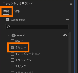エッセンシャルサウンドの「参照」から、「ムード」「ジャンル」を選択します。「ムード」に「さみしい」のチェックを入れ、今回は「STABLE」を表示させます。