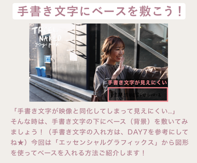 そんな時は、手書き文字の下に ベース(背景) を敷いてみましょう!(手書き文字の入れ方は、DAY6 を参考に!)