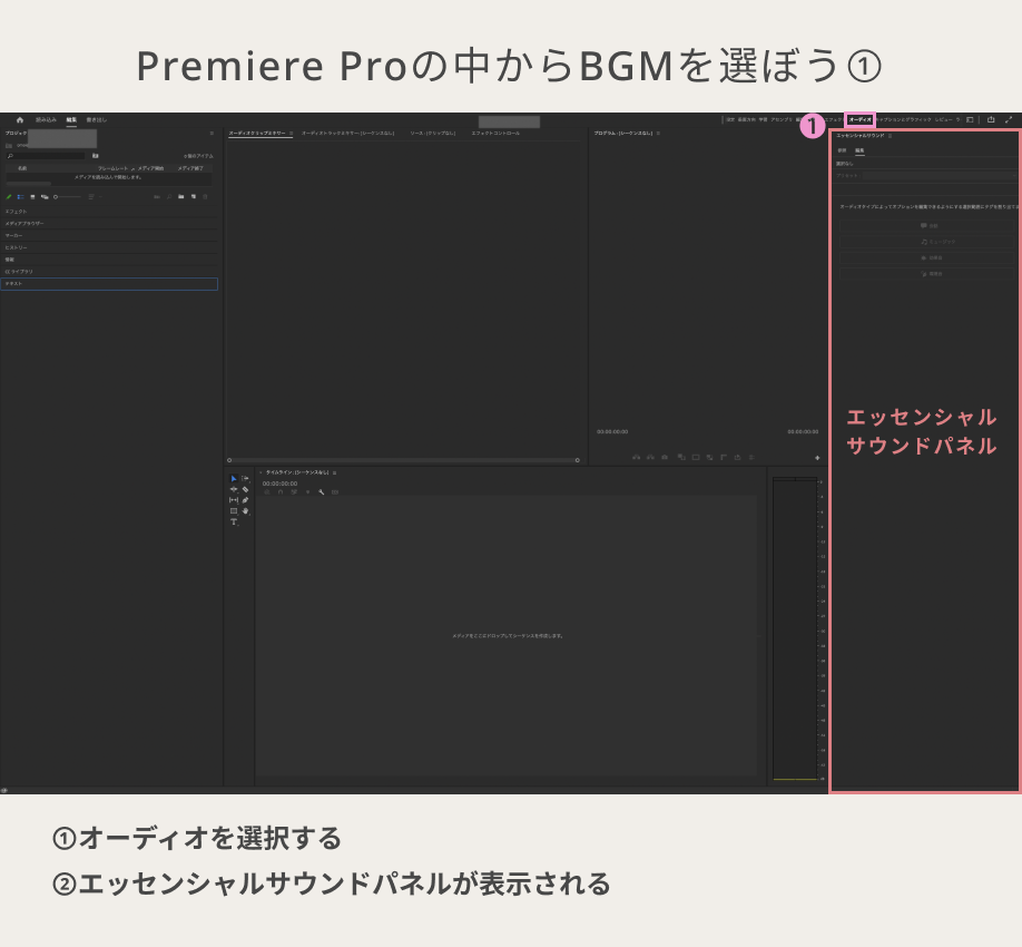 Premiere Proのワークスペースと呼ばれるタブからオーディオ に切り替えると右側にエッセンシャルサウンドパネル というパネルが出てきます。