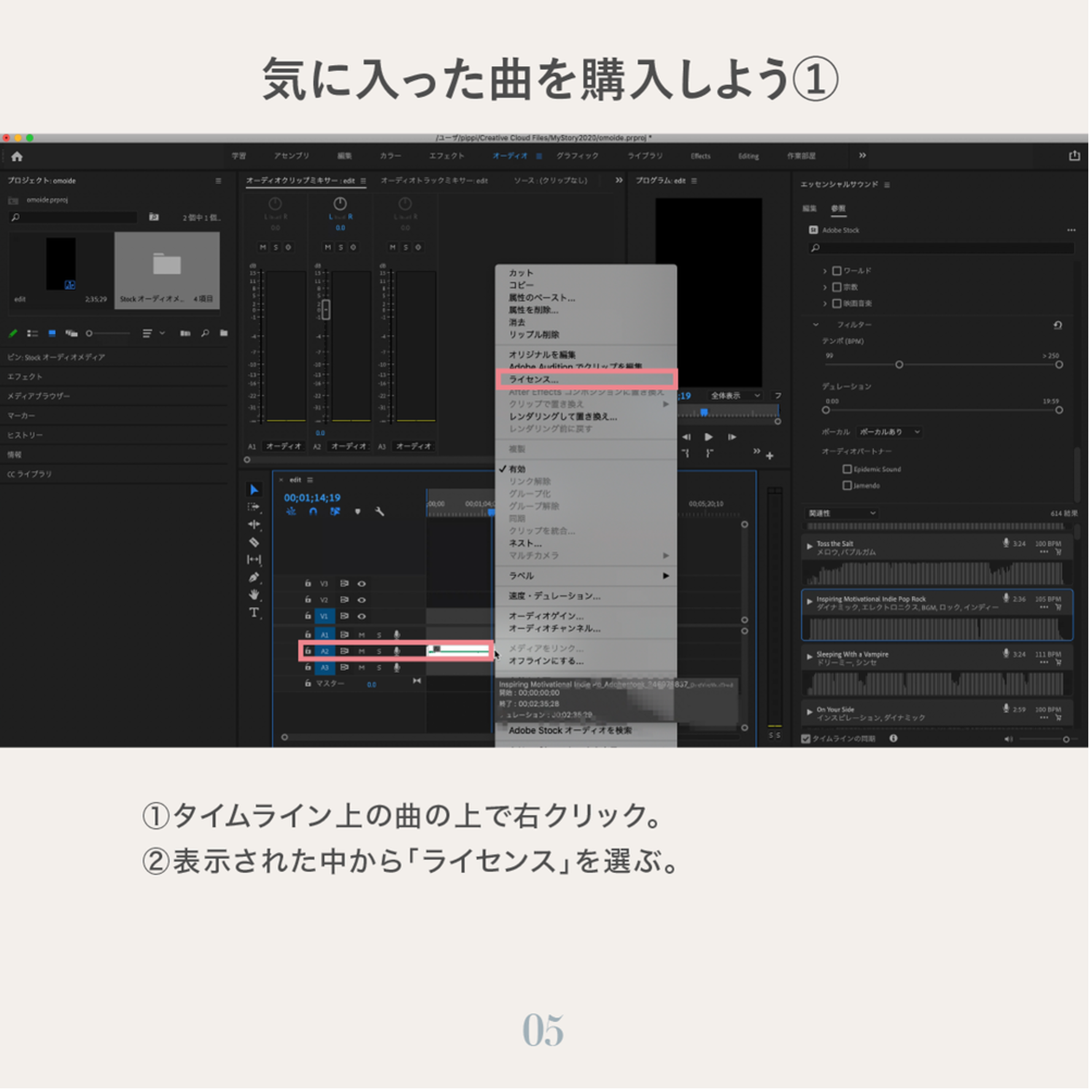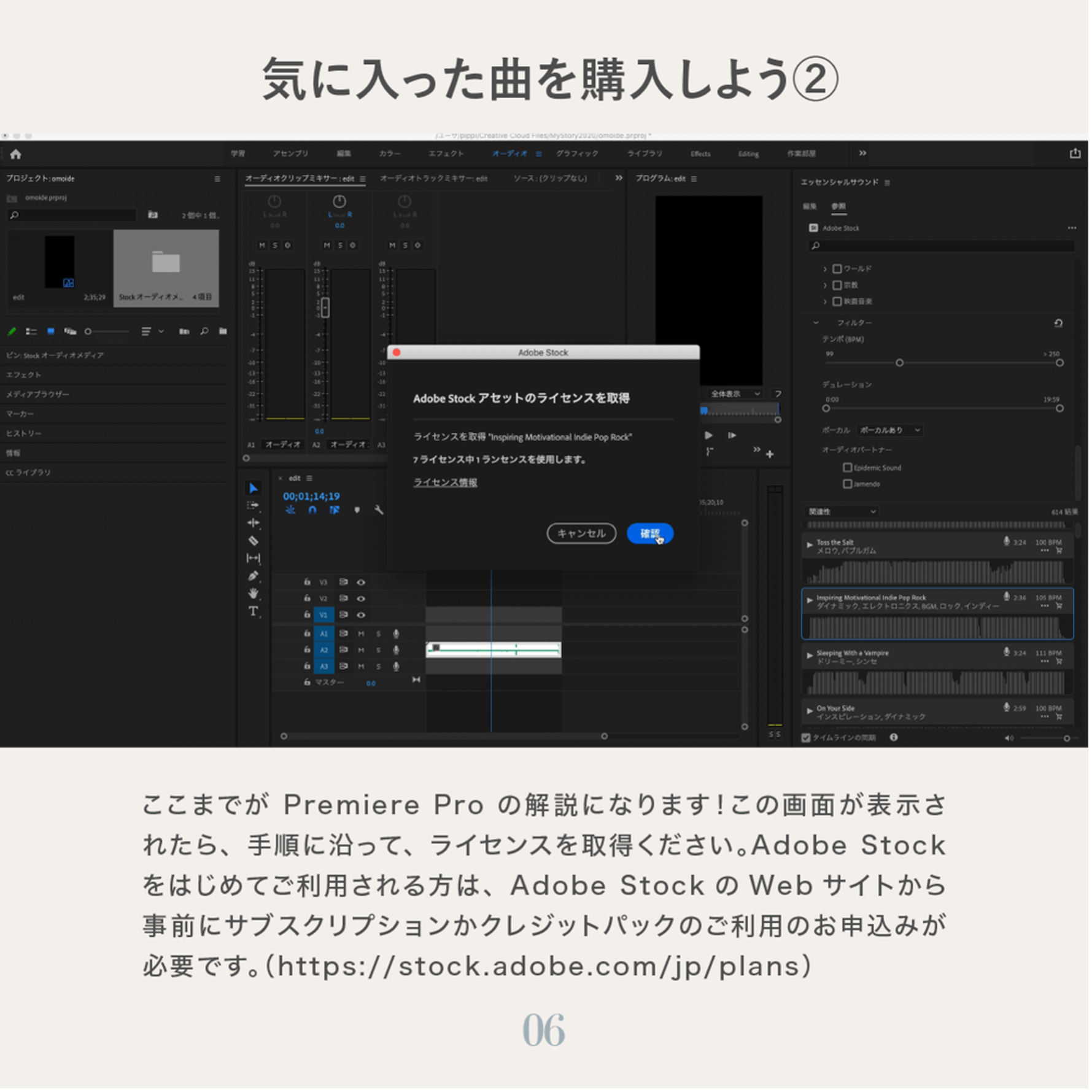 Adobe Stock オーディオはPremiere Proの中から購入手続きと、ライセンス版の差し替えが簡単にできます。