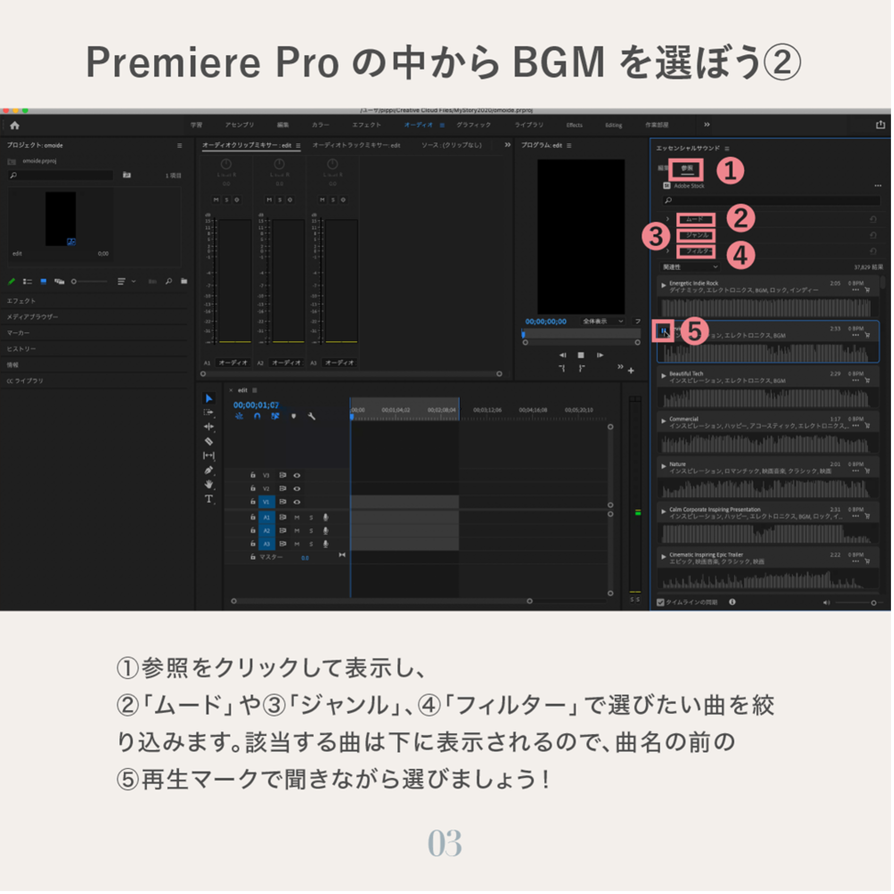 実は、Premiere Proの中から直接BGMを選ぶことができます。 Adobe Stockのオーディオサービスです。