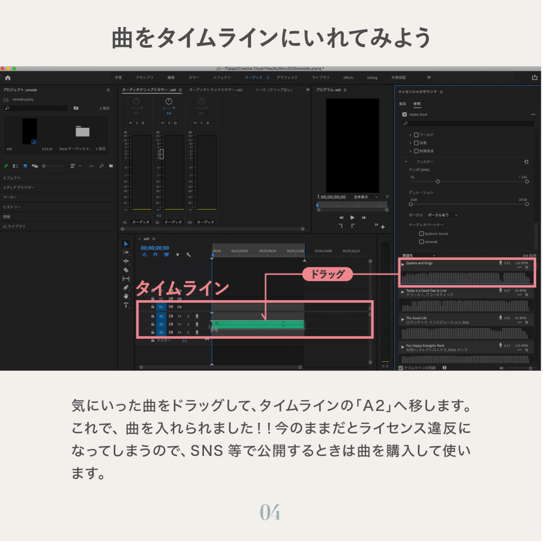 今入っているものはプレビュー用の音楽なので、このままの状態で使用してしまうとライセンス違反になります。