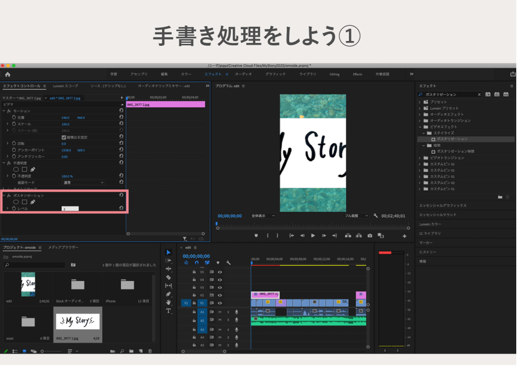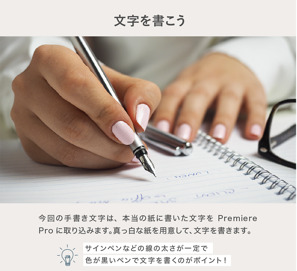 今回の手書き文字は、本当の紙に書いた文字をPremiere Proに取り込む という形で行います。