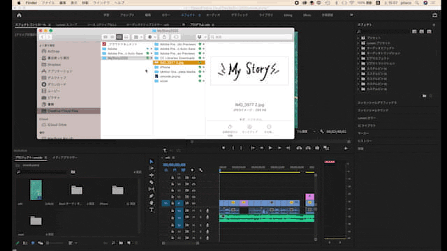 ①Creative Cloud Filesで転送した場合は画像を、シーケンスの文字を入れたい部分にドラッグ&ドロップします。
