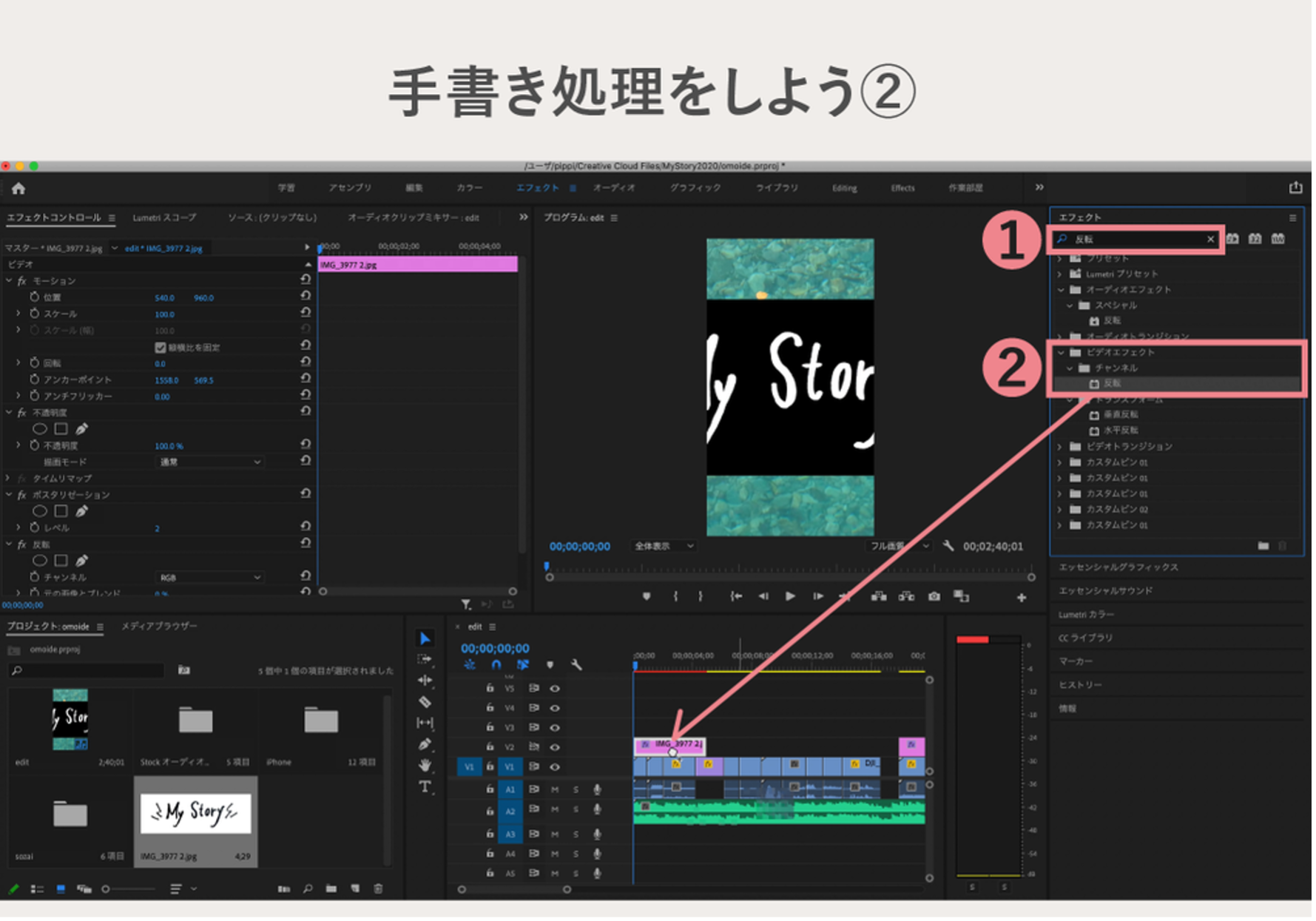 続いて、右上にある「エフェクト」で、「反転」 というエフェクト検索し、「ビデオエフェクト」>