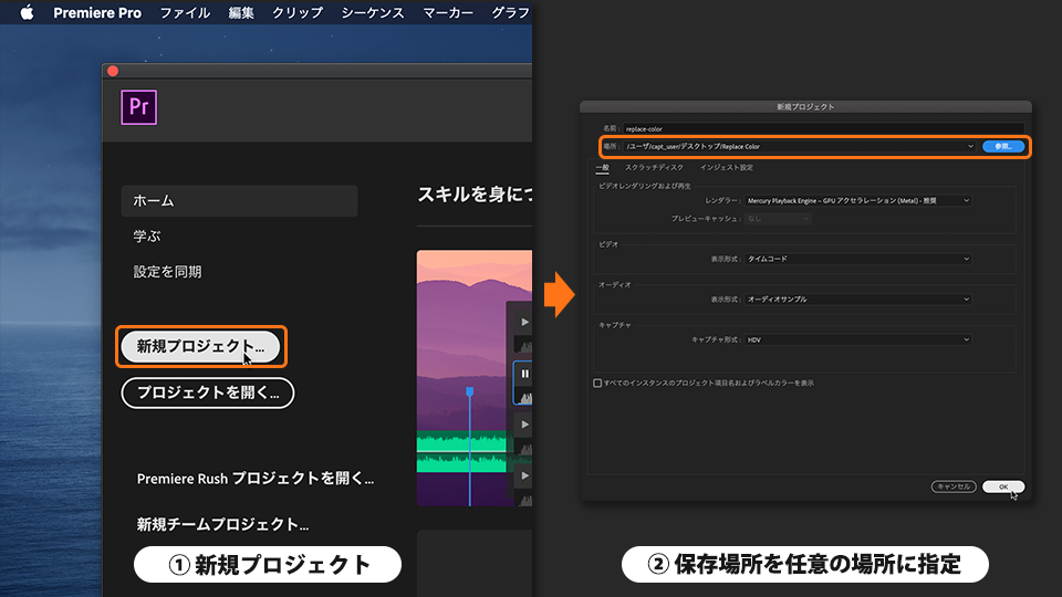 Premiere Proを起動し、ホーム画面で-「新規プロジェクト」を選択し、任意の場所に新しいプロジェクトを保存します。