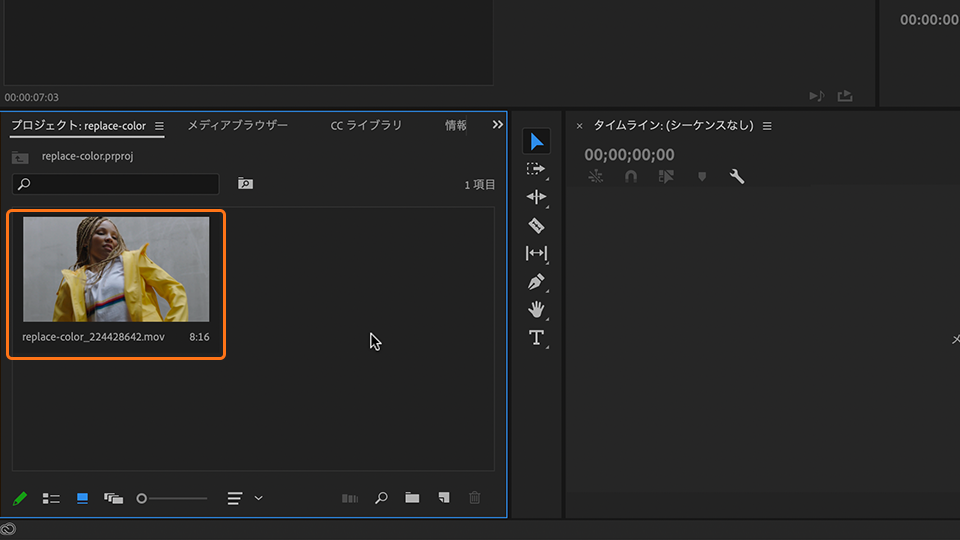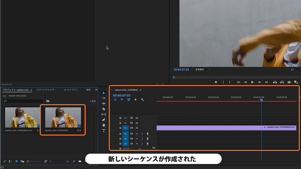素材の動画ファイルに適した形式で新しいシーケンスが作成されました。