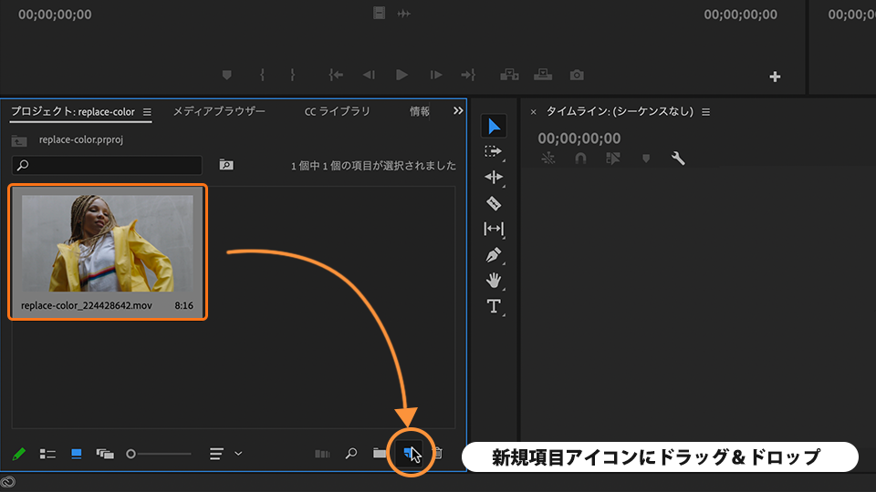プロジェクトパネル内で、動画ファイルを「新規項目」アイコンにドラッグ&ドロップします。