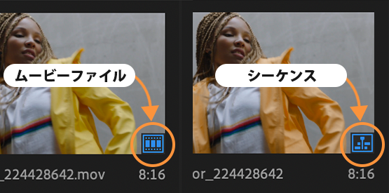 プロジェクトパネル内に作成されたシーケンスファイルと、素材の動画ファイルのサムネールは右下のアイコンで見分けることができます。