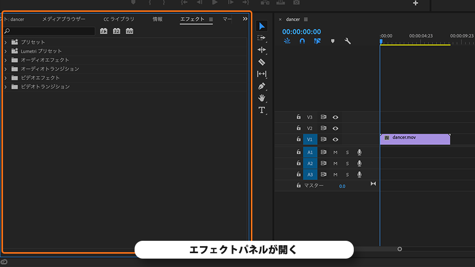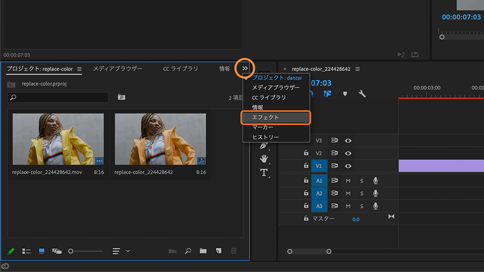 「プロジェクト」パネルの>>アイコンをクリックして、「エフェクト」を選択します。