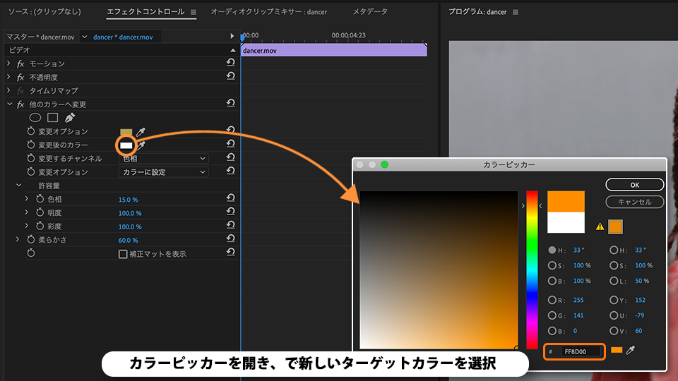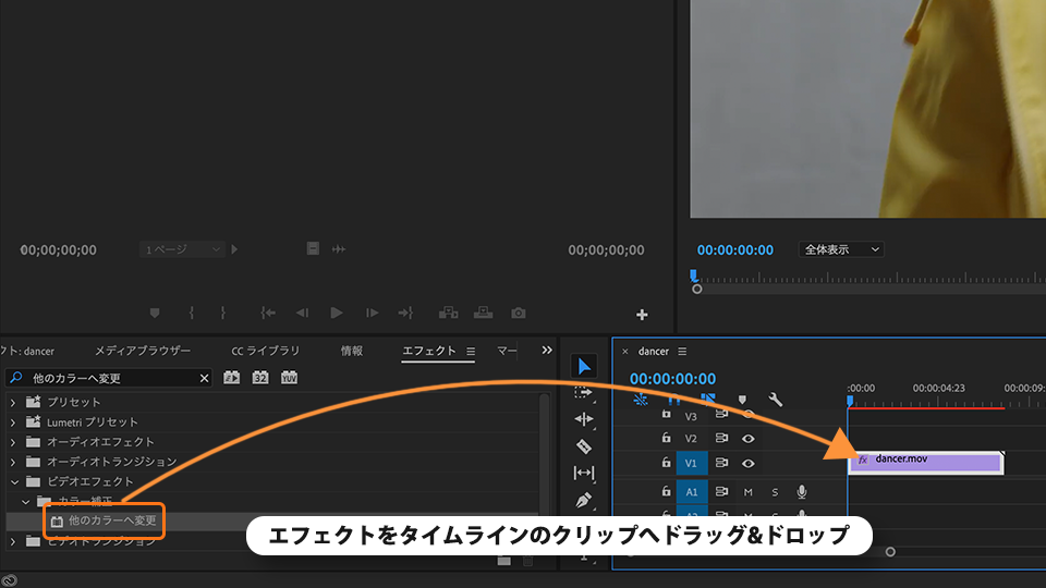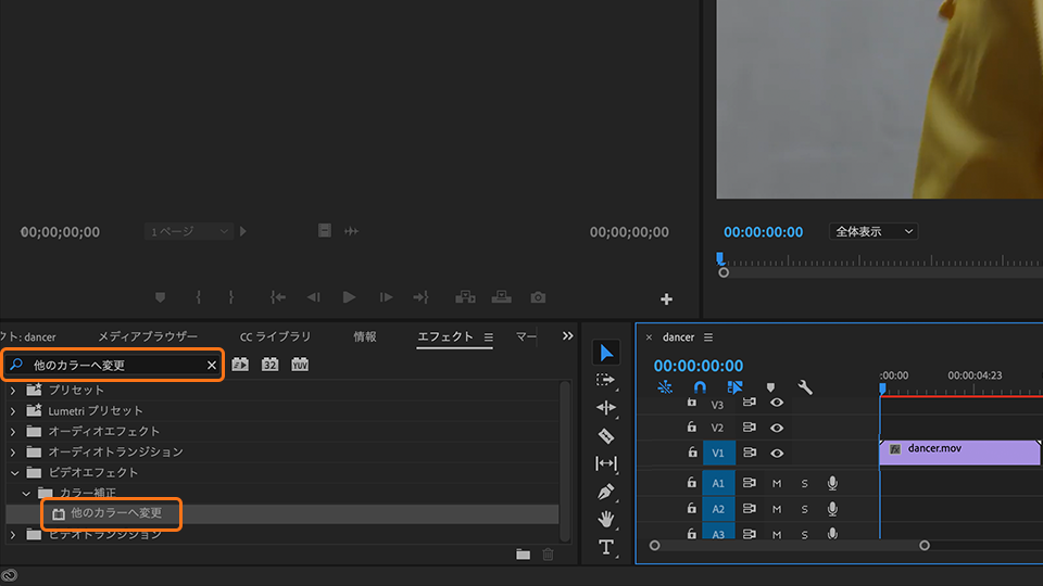 「エフェクト」パネルで「他のカラーへ変更」エフェクトを検索し、タイムラインに配置したクリップに適用します。