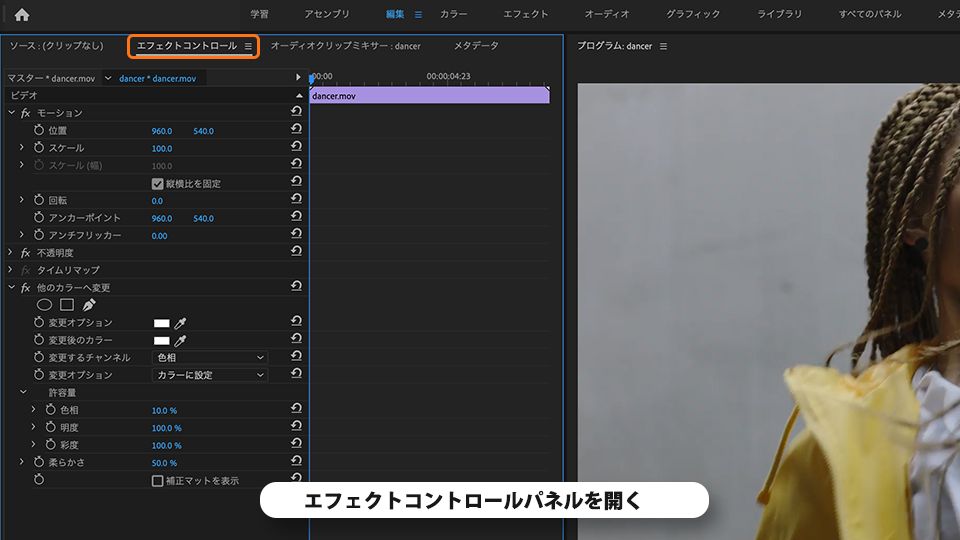 タイムライン上のクリップを選択して、「エフェクトコントロール」パネルを開きます。