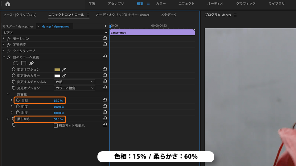 「色相」と「柔らかさ」を以下の値に調整して、「他のカラーへ変更」を微調整します。
