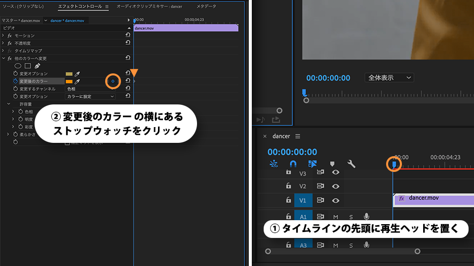 ベースとなるカラー、変更後のカラーなどを調整し、先頭フレームでのカラーの状態を設定します。