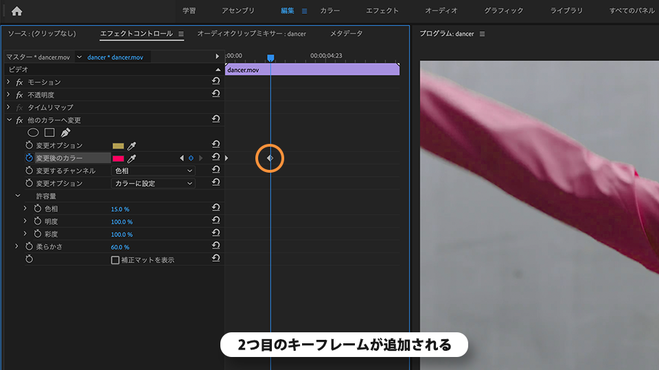 さらにここでは、エフェクトにキーフレームを設定することで、カラーが徐々に移り変わっていくアニメーションを設定しました。動画の表現力を高めるためにご使用ください。