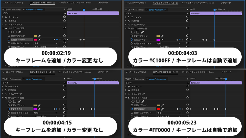 「変更後のカラー」の横にあるストップウォッチをクリックして、キーフレームを追加します。