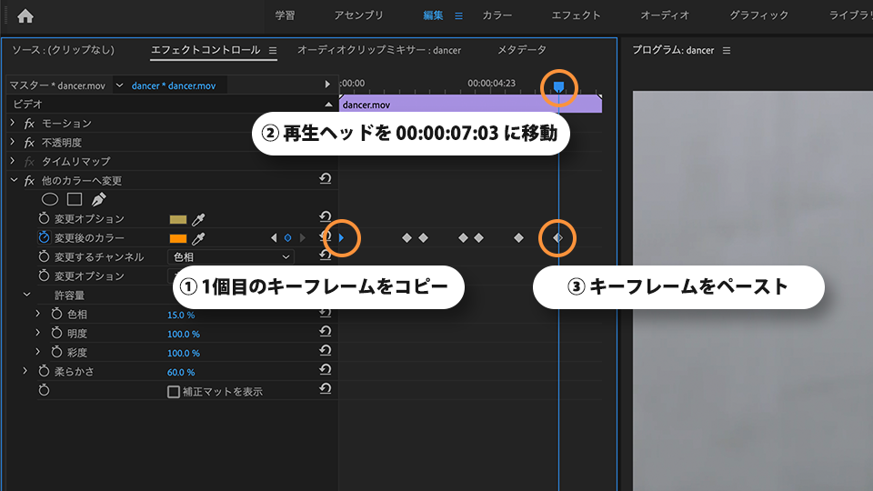 1個目のキーフレームをコピー(右クリック/ コピー)し、00:00:07:03の位置にペースト(右クリック/ ペースト)します。