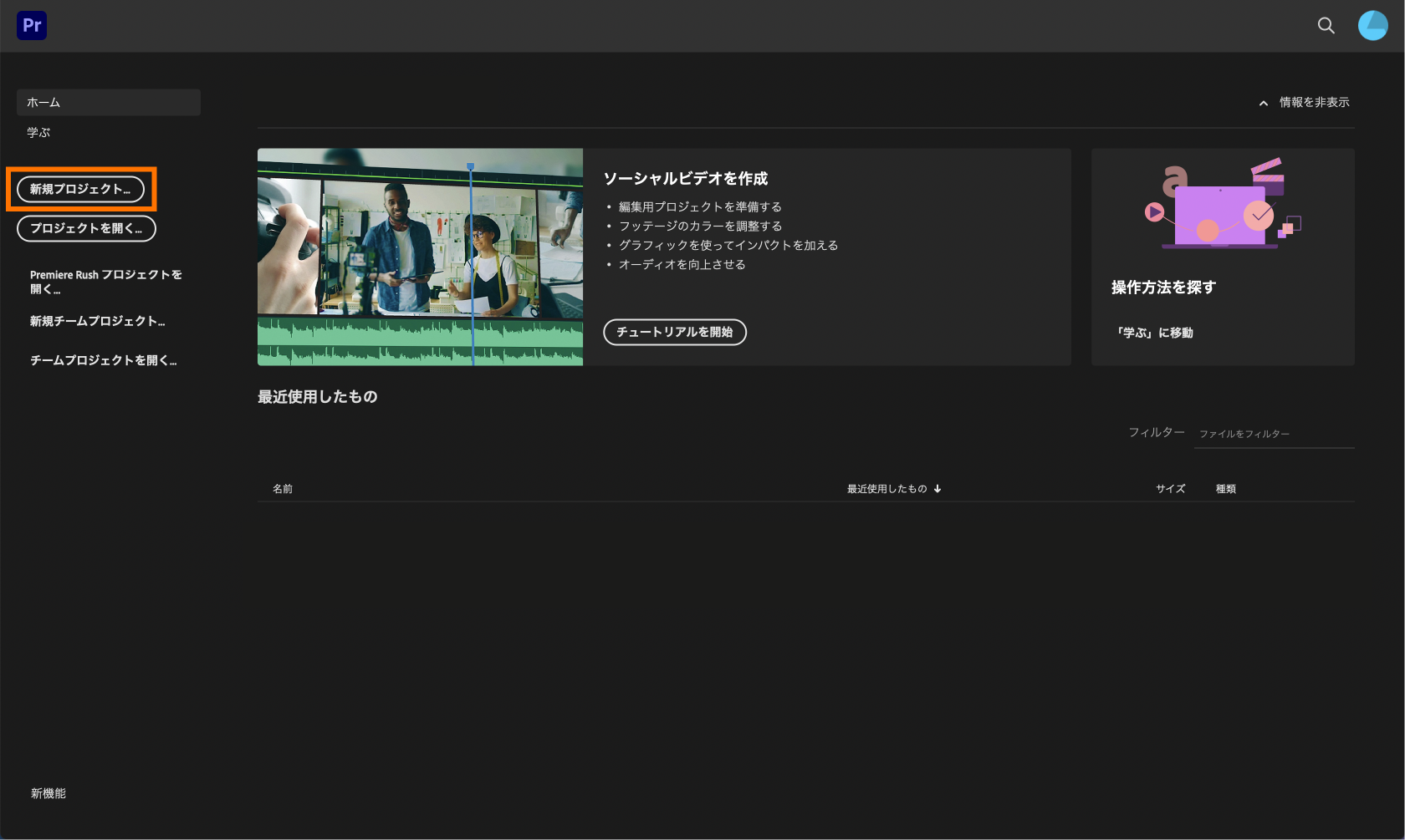 Premiere Pro を起動し、スタート画面の「新規プロジェクト」をクリックします。