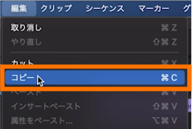 タイムラインの[V1]をクリックし選択を解除します。[V2]のみが選択されている状態でメニューの「編集」から「ペースト」を選択し複製します。