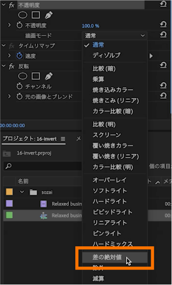 「ビデオエフェクト」内の「反転」エフェクトが表示されたら、