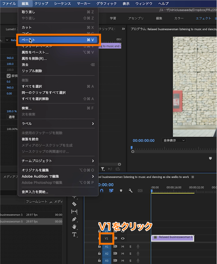 タイムラインの[V1]にある撮影素材「Relaxed businesswoman listening to music and dancing as she walks to work(AdobeStock_175549950)」を選択し、メニューの「編集」から「コピー」を選択します。