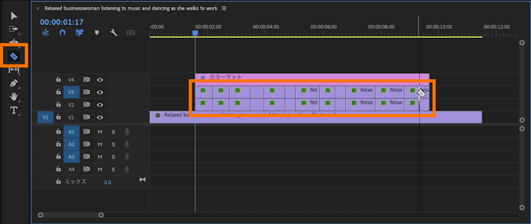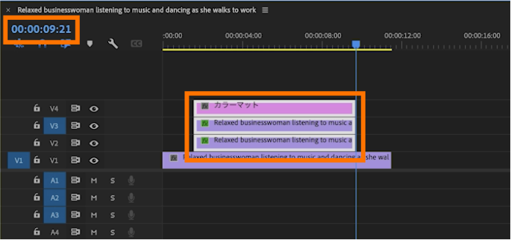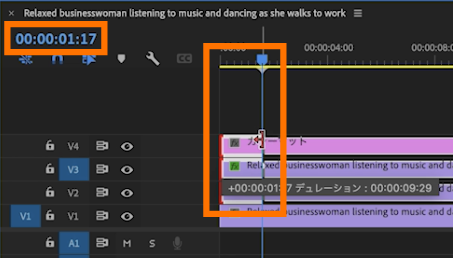 再生ヘッドを「00:00:01:17」に移動させ、[V2]から[V4]の「Relaxed businesswoman listening to music and dancing as she walks to work(AdobeStock_175549950)」と「カラーマット」の開始位置を移動。