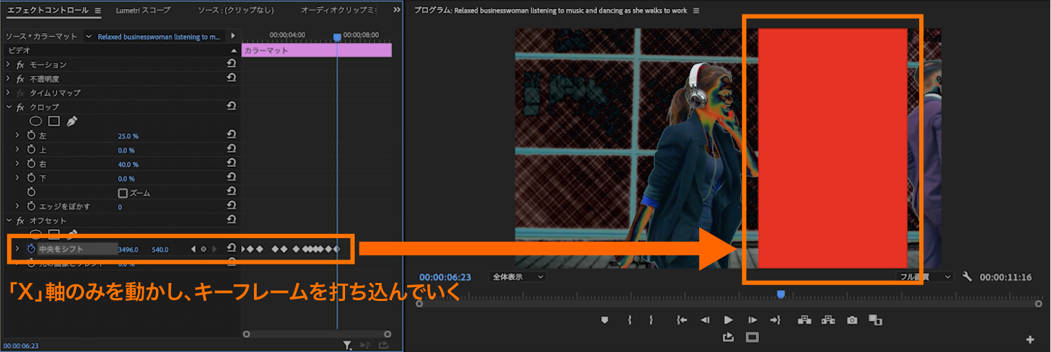 再生ヘッドを「00:00:01:17」に移動させ、「カラーマット」を選択し、エフェクトコントロールパネル内の「オフセット」を開きます。「中央をシフト」にキーフレームを打ち込んでいきます。