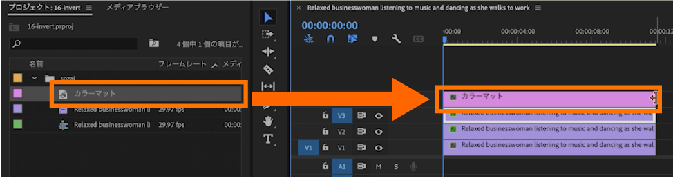 [V2]から[V4]の「Relaxed businesswoman listening to music and dancing as she walks to work(AdobeStock_175549950)」と「カラーマット」の終了位置を移動させます。