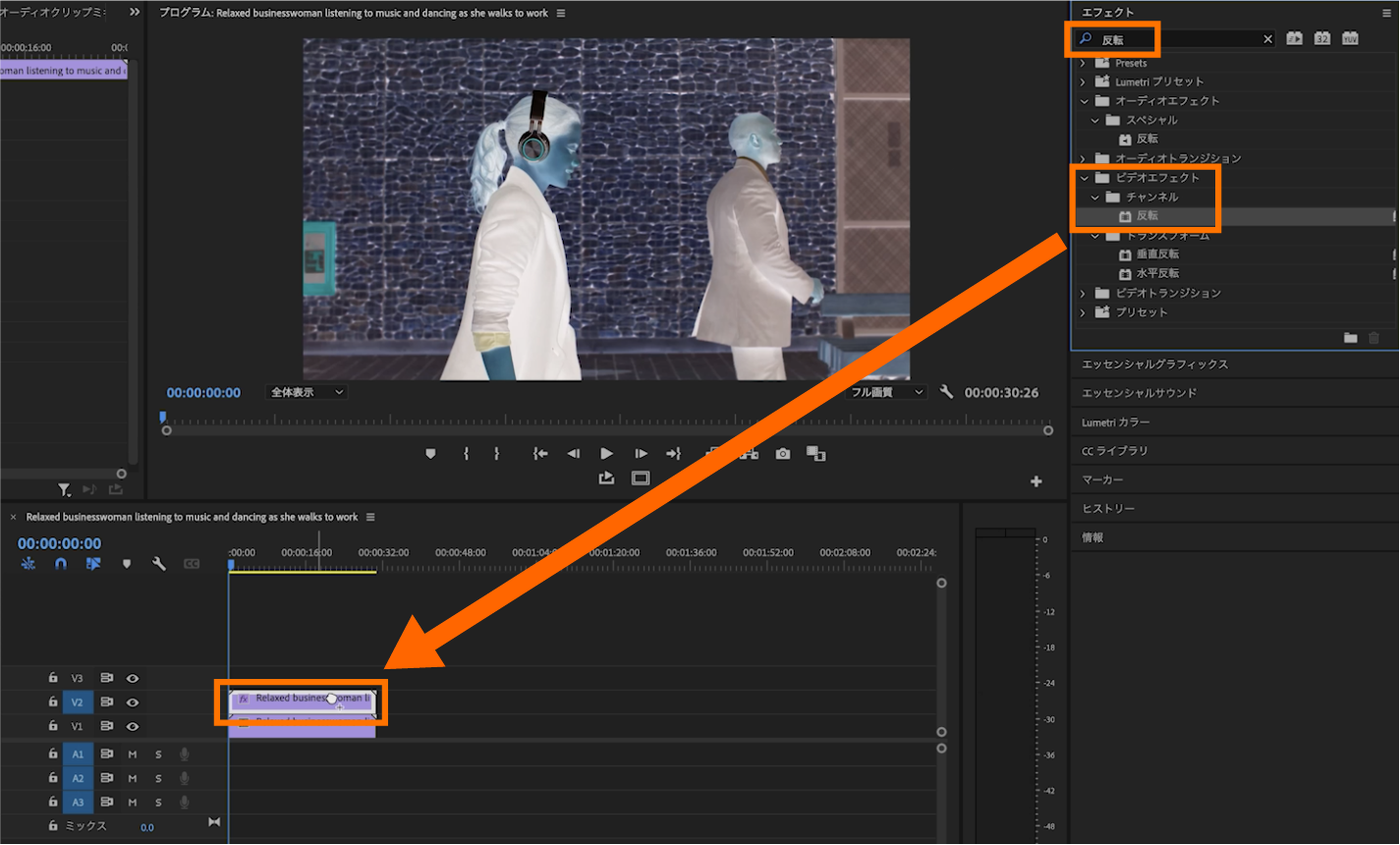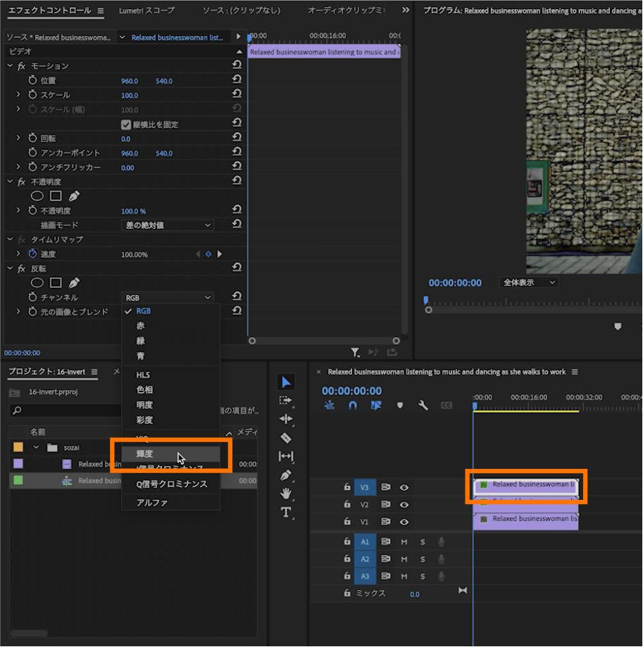 「反転」を適用した[V2]の「Relaxed businesswoman listening to music and dancing as she walks to work(AdobeStock_175549950)」を[V3]に複製し、「エフェクトコントロール」内の「反転」の中から「チャンネル」を「輝度」に変更します。