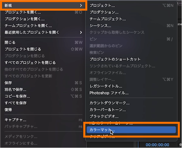 メニューの「ファイル」から「新規」を開き「カラーマット…」を選択し「カラーマット」を作成します。この時使用する色は何色でも構いません。