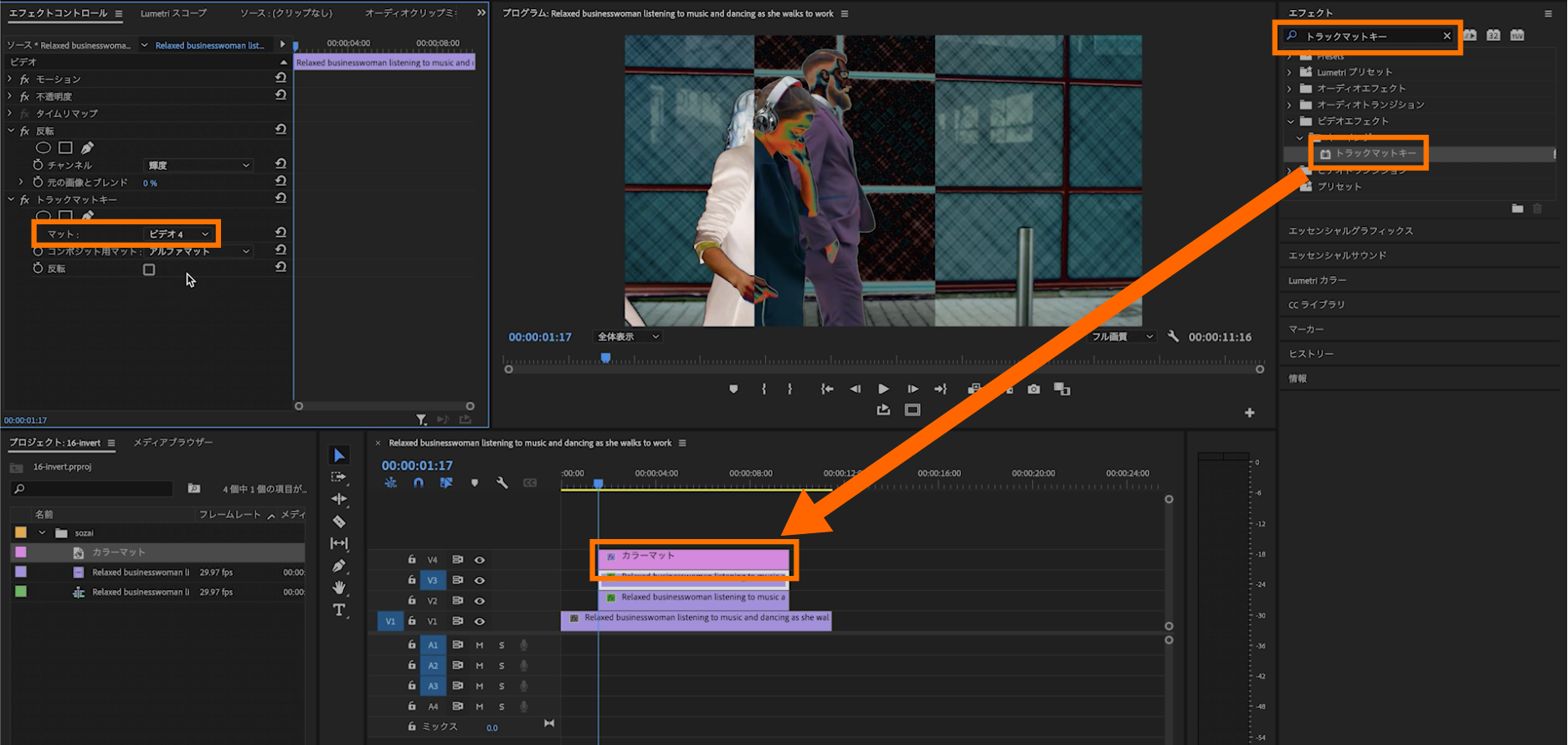 「エフェクト」パネルの検索フィールドに「トラックマットキー」と入力します。「トラックマットキー」エフェクトが表示されたら、それをタイムラインV2とV3の「Relaxed businesswoman listening to music and dancing as she walks to work(AdobeStock_175549950)」にドラッグ&ドロップで適用します。