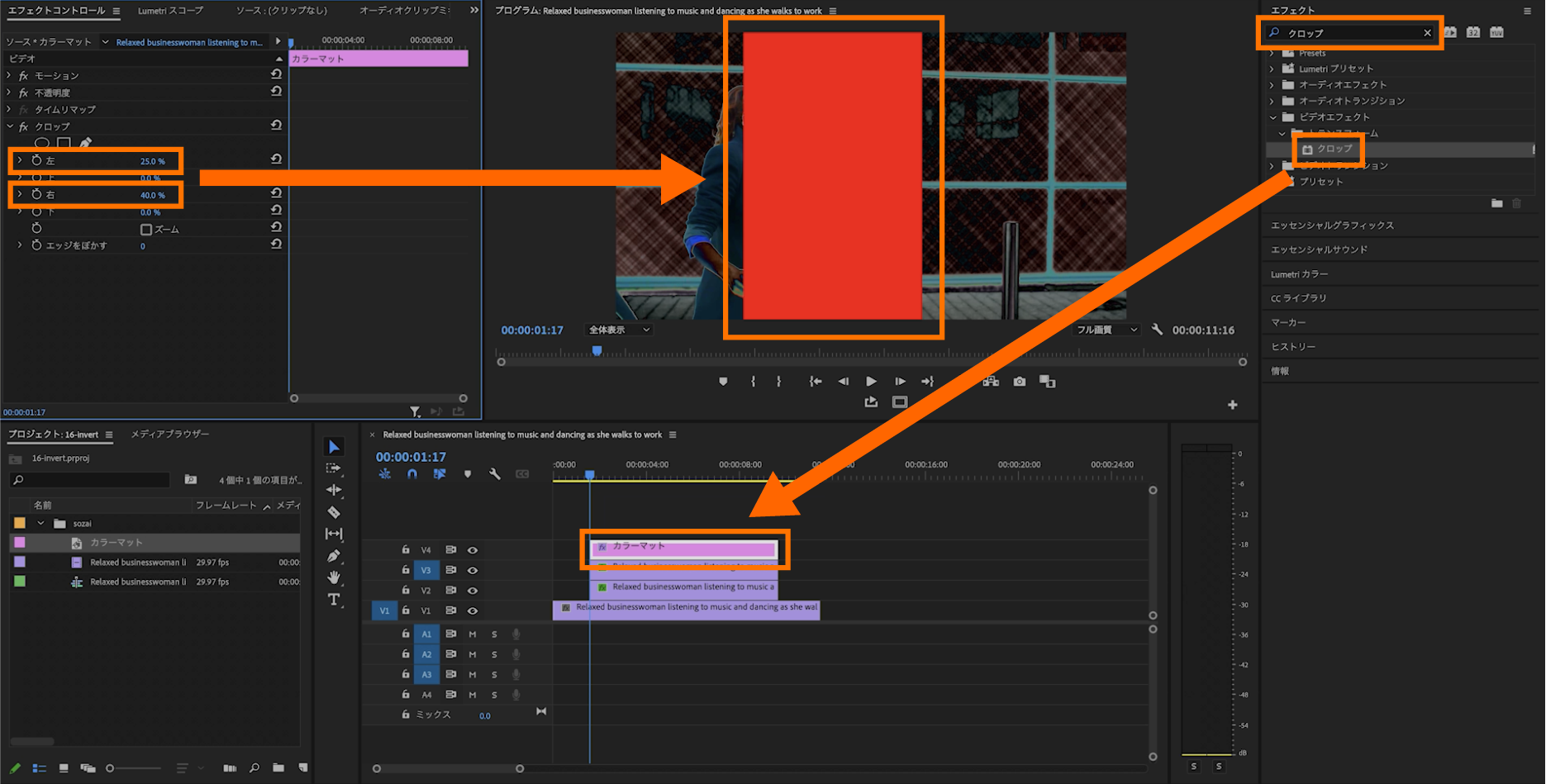 「エフェクト」パネルの検索フィールドに「クロップ」と入力します。「クロップ」エフェクトが表示されたら、それをタイムライン[V4]上のカラーマットにドラッグ&ドロップで適用します。エフェクトコントロールパネルを開き「クロップ」を「左:25.0%」「 右:40.0%」に設定します