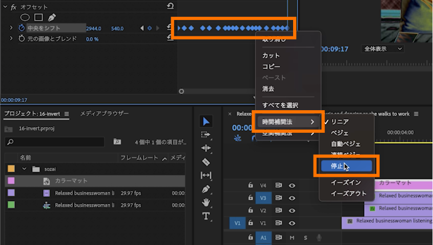 キーフレームを全て選んで右クリック、「時間補間法」から「停止」を選択します。