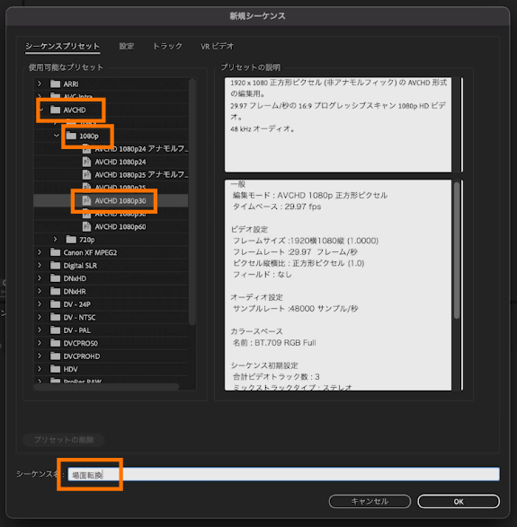 「プロジェクト」パネルを右クリック新規項目から「シーケンス...」を作成します。「レガシー」「AVCHD」「1080p」「AVCHD 1080p30」を選択し、その際シーケンス名を「場面転換」に変更し[OK]を押します。