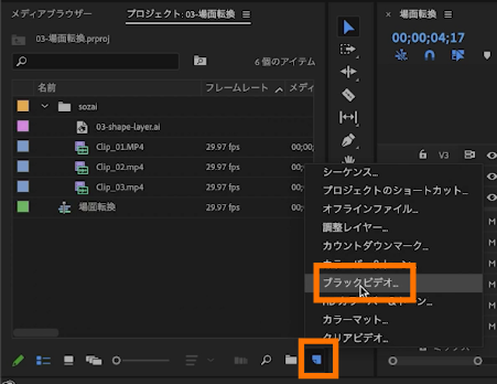※ブラックビデオの項目が見つからない場合は、「プロジェクト」パネルを選択した状態で、PC上のツールバーから「ファイル」→「新規」→「ブラックビデオ」から適用できます。