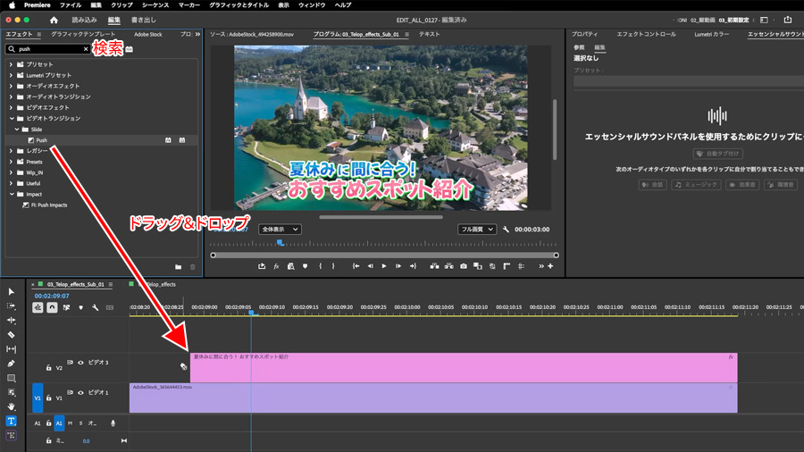 エフェクトパネルで「Push」と検索してみましょう。