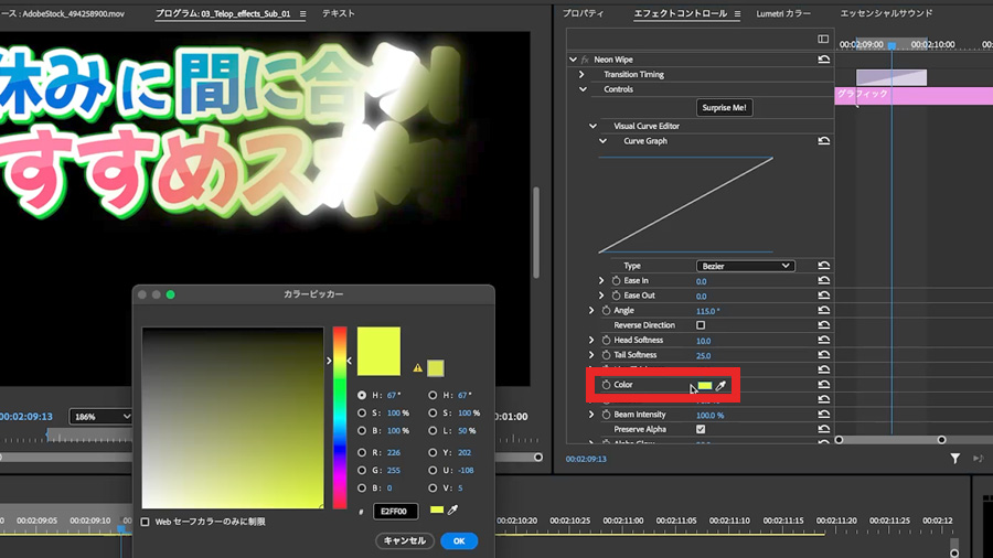 デフォルトではピンクっぽい色ですが エフェクトコントロールパネルで 「Color」のところを調整すると お好みの色に変更できます。