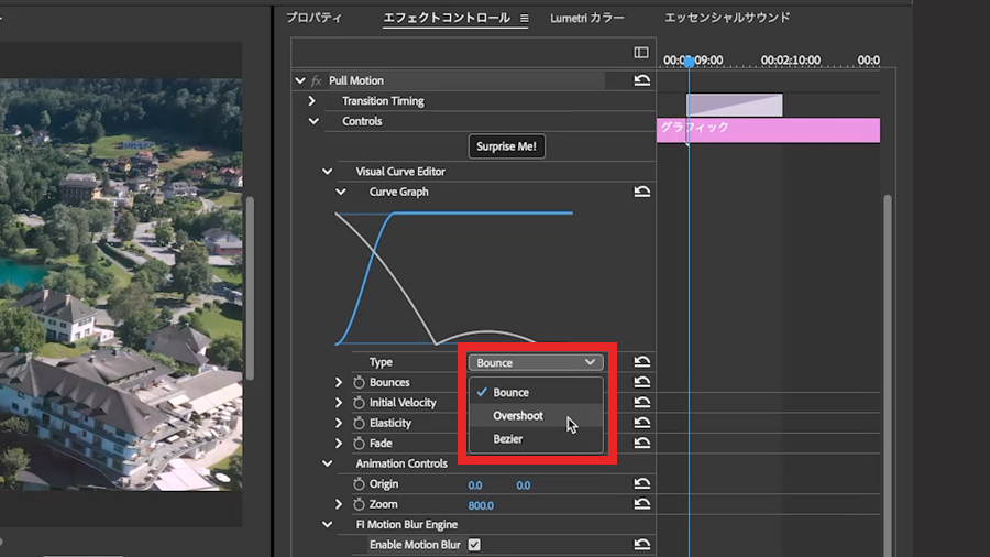 エフェクトコントロールパネル/Visual Curve Editor/Typeには Bounce・Overshoot・Bezierの3つのタイプがありまして Bounceは着地して跳ね返るような動き Overshootはボヨヨンという感じで余韻が残るような動き Bezierはシンプルで落ち着いていて、スッという感じで入ってきます。
